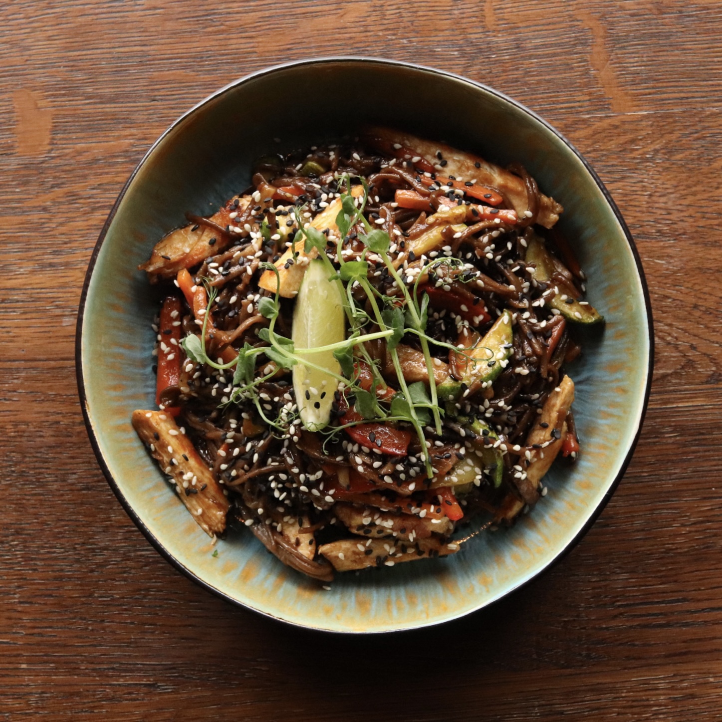 Мікс салату, слабо солений лосось, авокадо, яйце пашот. Заправлений медово-лимоним соус та прекрашений кунжутом.
